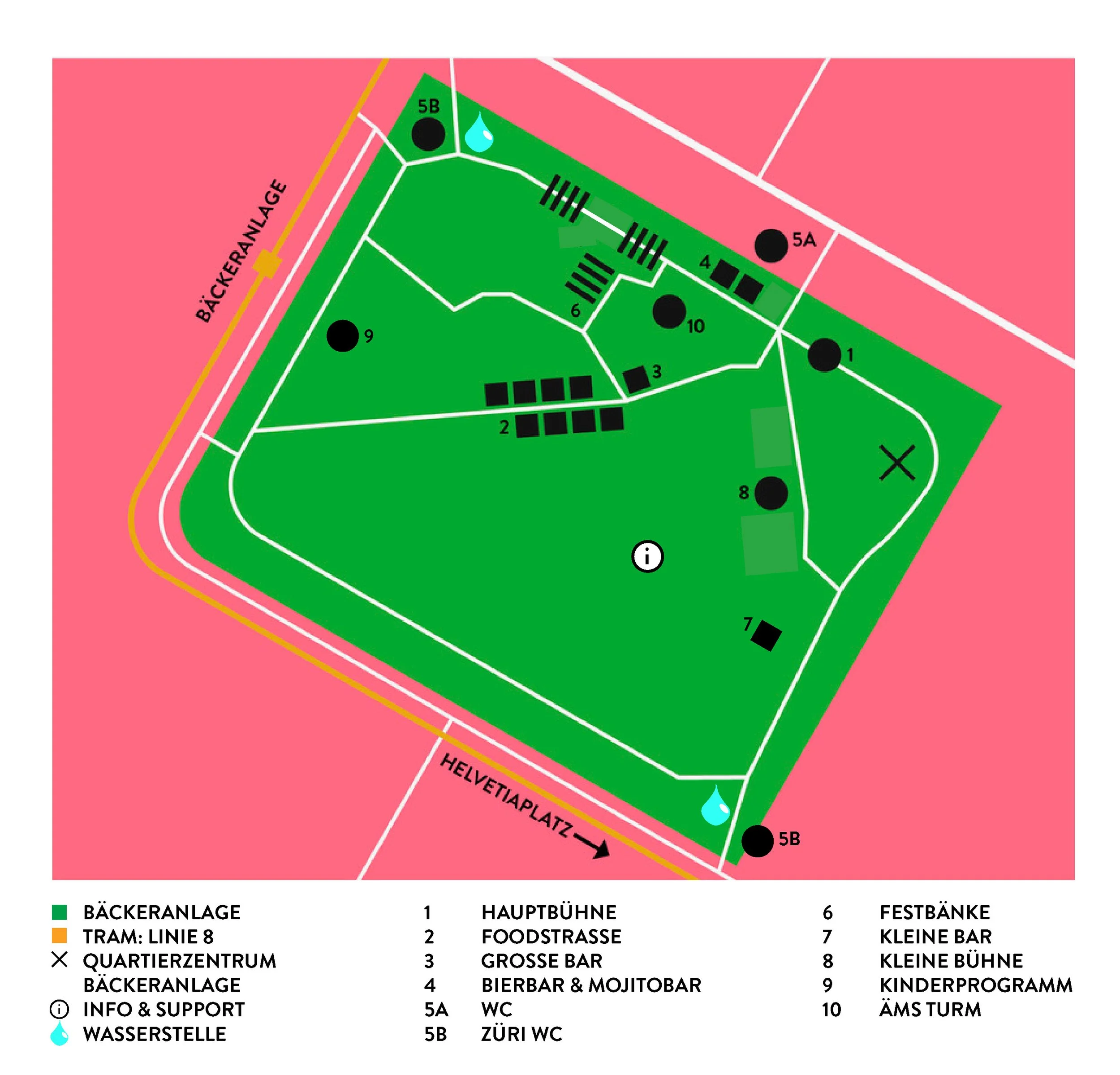 Äms Fäscht findet auf der Bäckeranlage im multikulturellen Kreis 4 statt – im Herzen der Stadt Zürich.